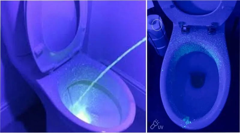 A empresa QS Supplies usou luz ultravioleta e líquidos fluorescentes para simular a micção masculina em pé. O resultado foi alarmante: gotículas invisíveis de urina podem respingar a até 90 cm de distância, atingindo paredes, espelhos e até escovas de dente próximas.