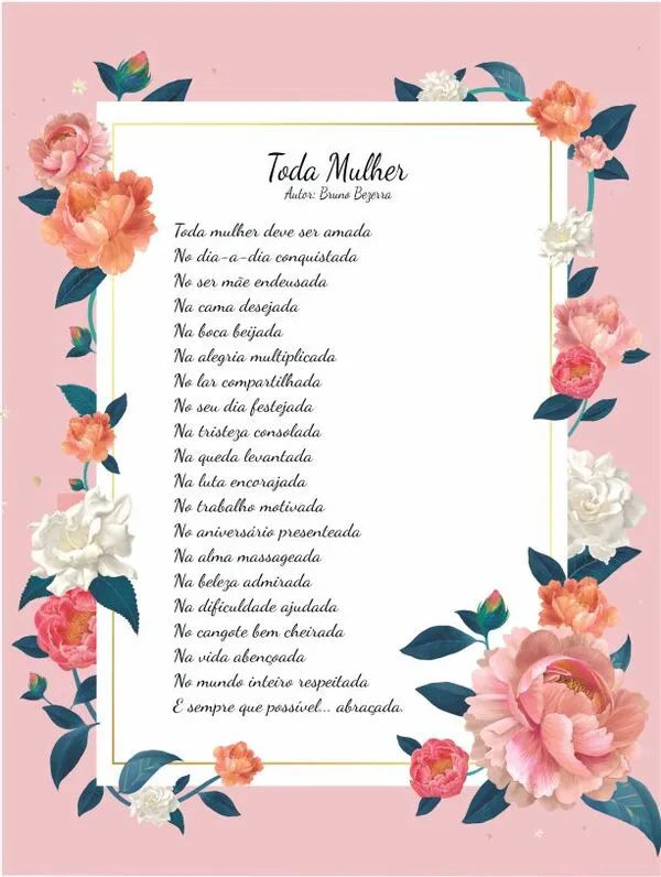 É dentro desse espírito que apresentamos hoje o poema “Toda Mulher”, atribuído ao autor Bruno Bezerra. Trata-se de um texto simples, sensível e profundamente humano, que procura retratar a essência feminina em sua beleza interior e na grandeza presente em cada momento de sua existência.